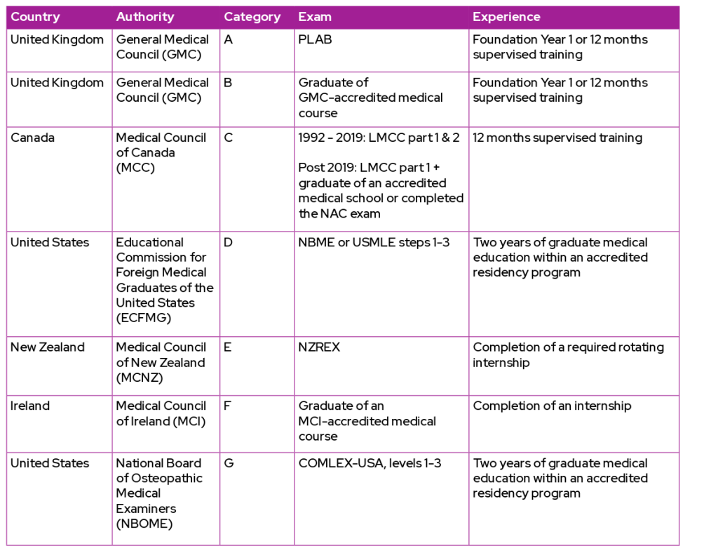 Both the examination AND the experience are required to qualify for the competent authority pathway. The Medical Board will accept an application from an IMG who has completed a medical program or assessment from one category and the experience component from another category as long as the component is completed exactly as defined in that category and approved by the competent authority of the country in which it was completed.